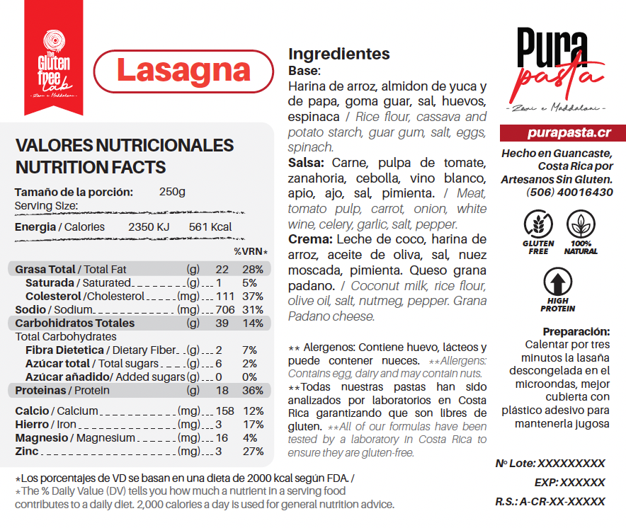 - Nuestra lasaña boloñesa PuraPasta está hecha con pasta de arroz y espinaca, salsa de carne con vegetales y crema a base de leche de coco, 100% sin gluten, alta en proteína (+12 g) y sin colorantes, conservantes ni emulsificantes artificiales.